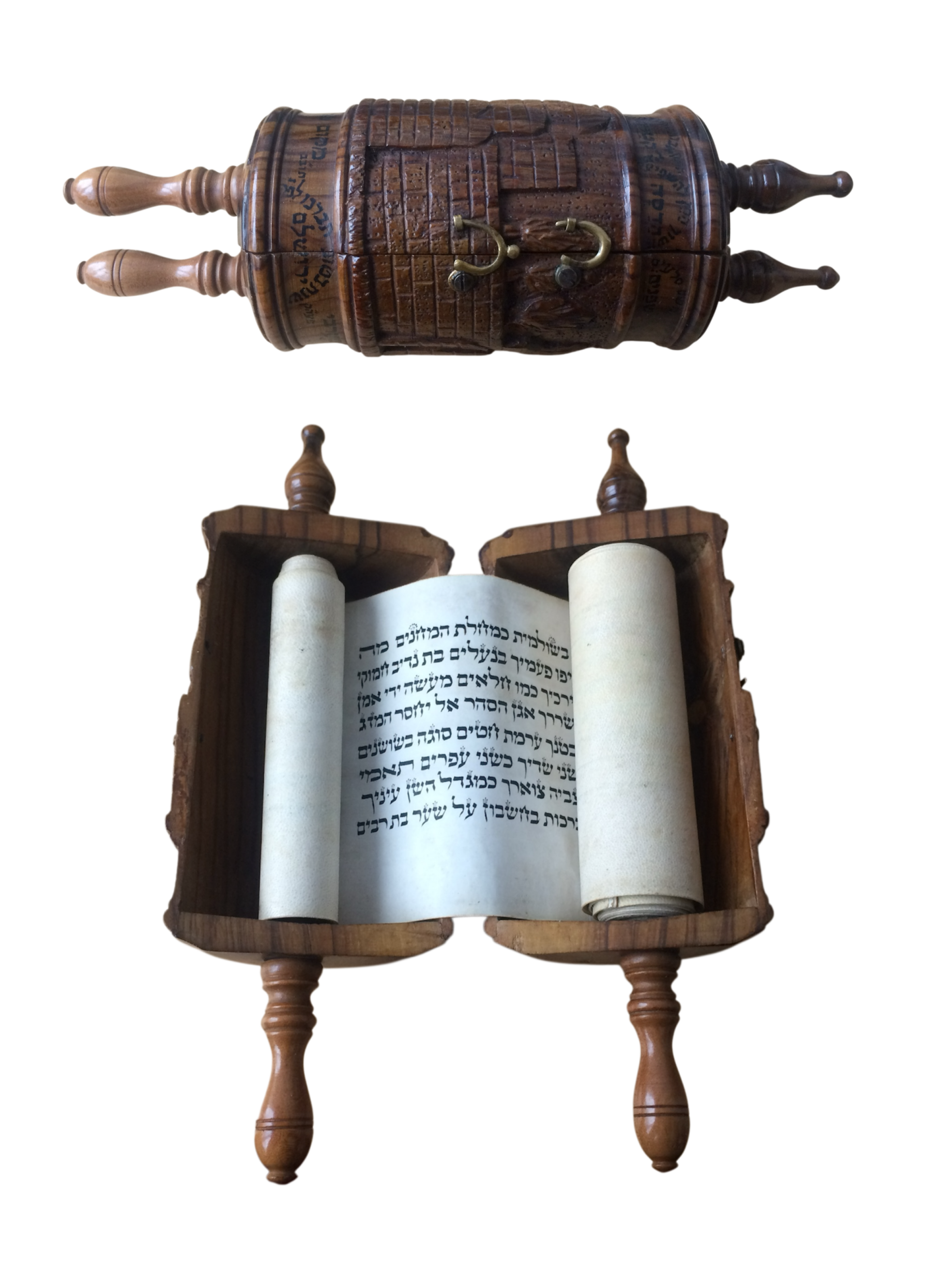 It was a small wooden cylinder, finely carved, holding a calligraphy of the Song of Songs. The casing depicts the Mount of Olives and bears Hebrew inscriptions. In one of its panels, a tiny slide of the Kotel from the late 19th century can be seen. Inside, the calligraphed text unfolds on two spindles, like a Torah scroll, revealing the love song of God to His people.