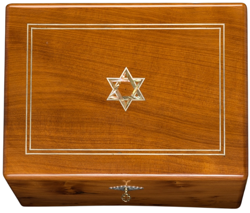 Tikkun Box - The Heritage Edition is a handcrafted replica memory box: 330 mm / 13.0″ wide, 235 mm / 9.3″ deep, 160 mm / 6.3″ high at the front, 235 mm / 9.3″ at the back. Designed in the authentic proportions of the original, this heirloom-quality keepsake chest is perfect for storing precious mementos, heritage items, or as a unique gift box.